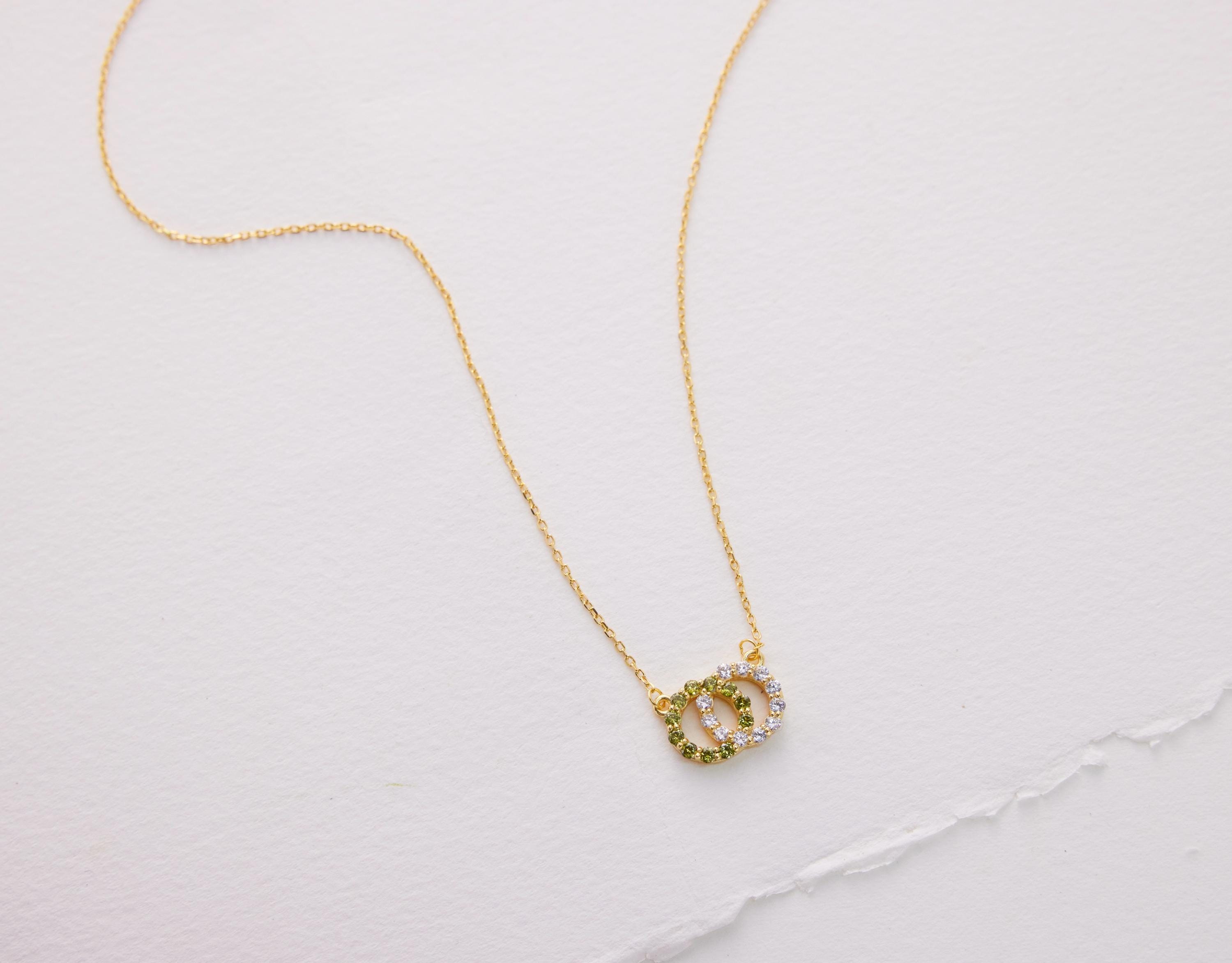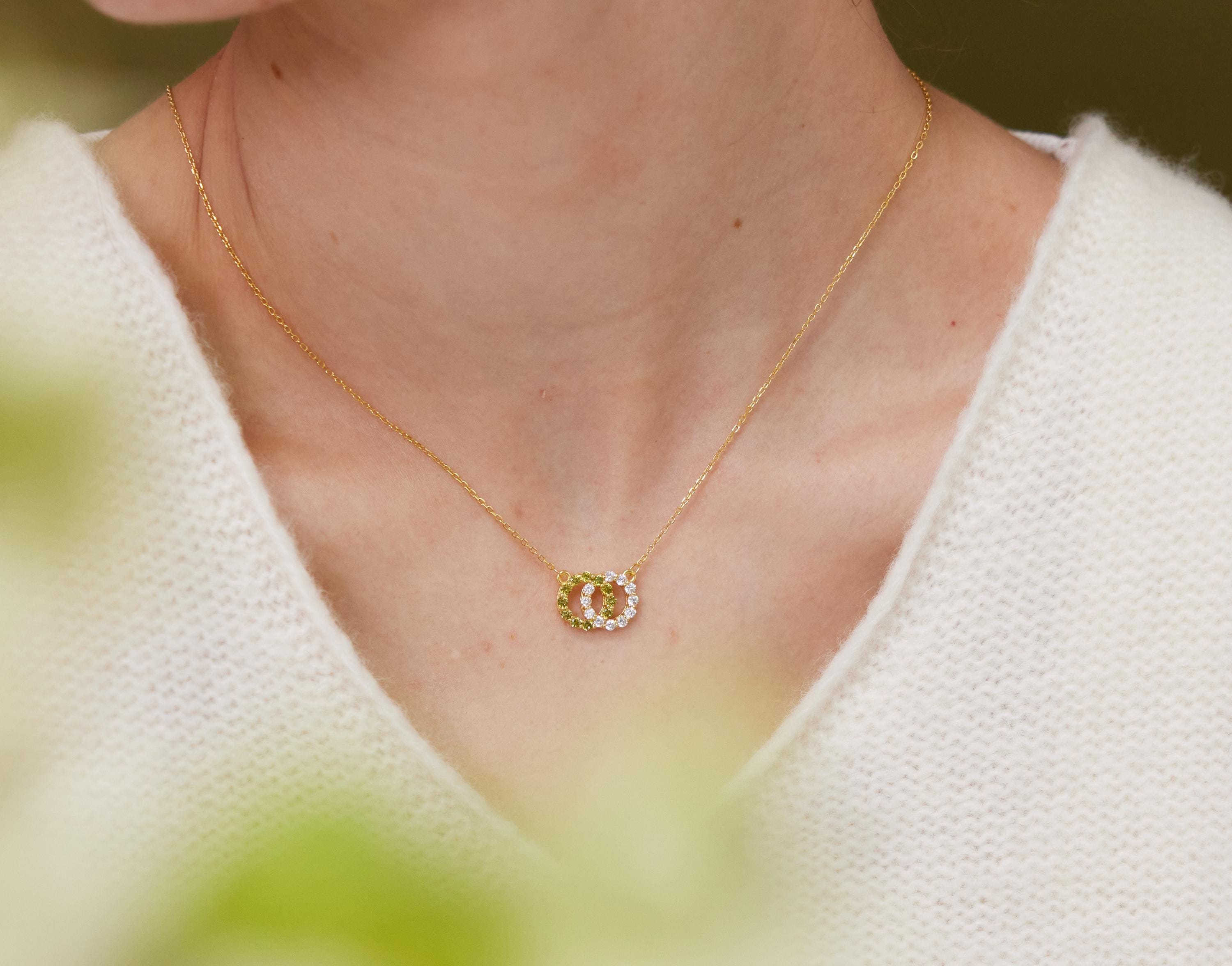 Featuring two interlocking circles, each adorned with a custom birthstone color of your choice, this necklace symbolizes two souls forever linked. Perfect for mothers and daughters, sisters, best friends, or partners — it’s a piece that speaks of love that knows no distance.
