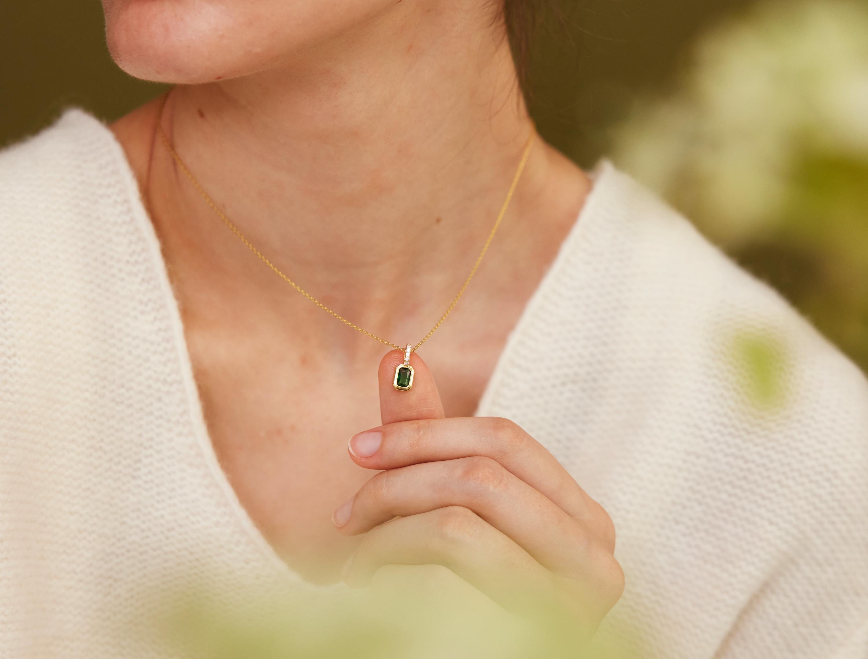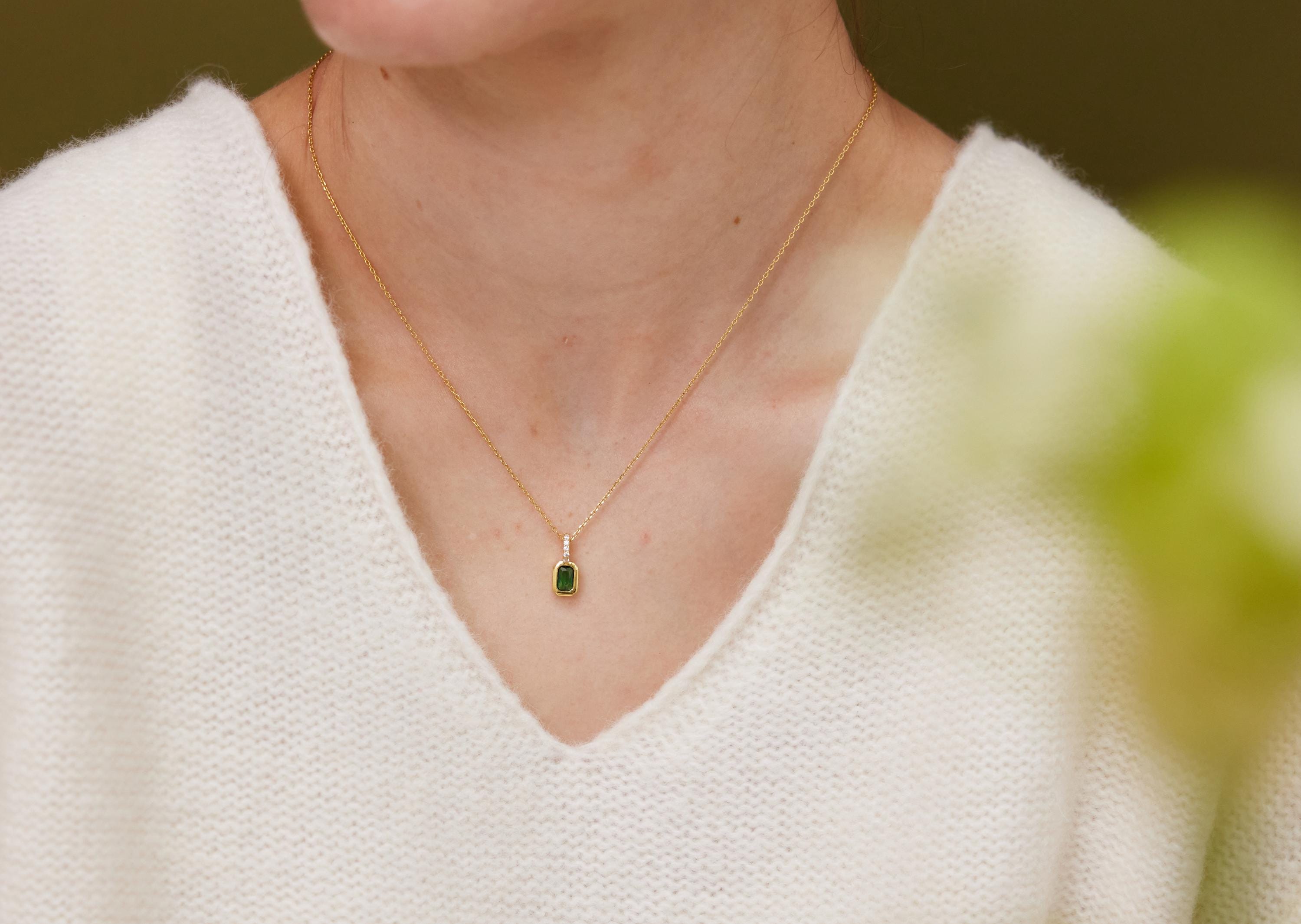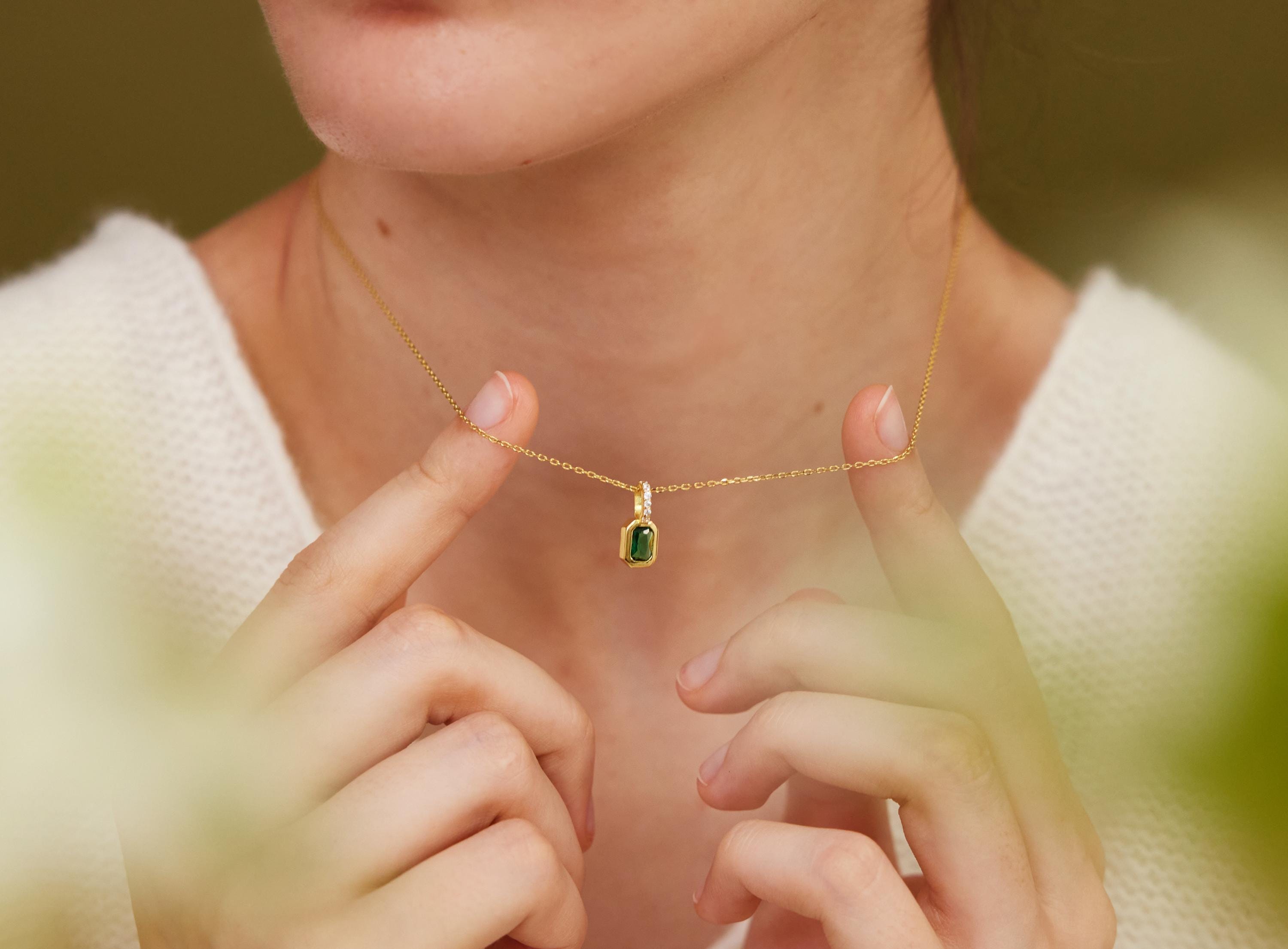 Known as the May birthstone, emerald symbolizes hope, harmony, and vitality. This minimalist pendant adds a rich pop of green sparkle that effortlessly elevates any outfit.
