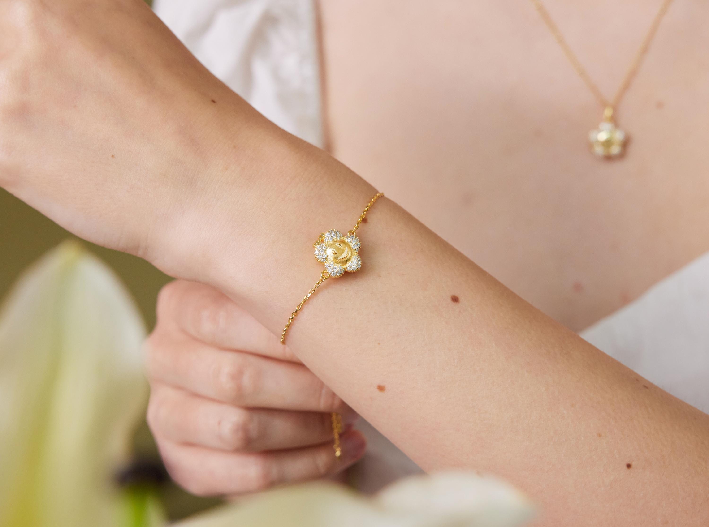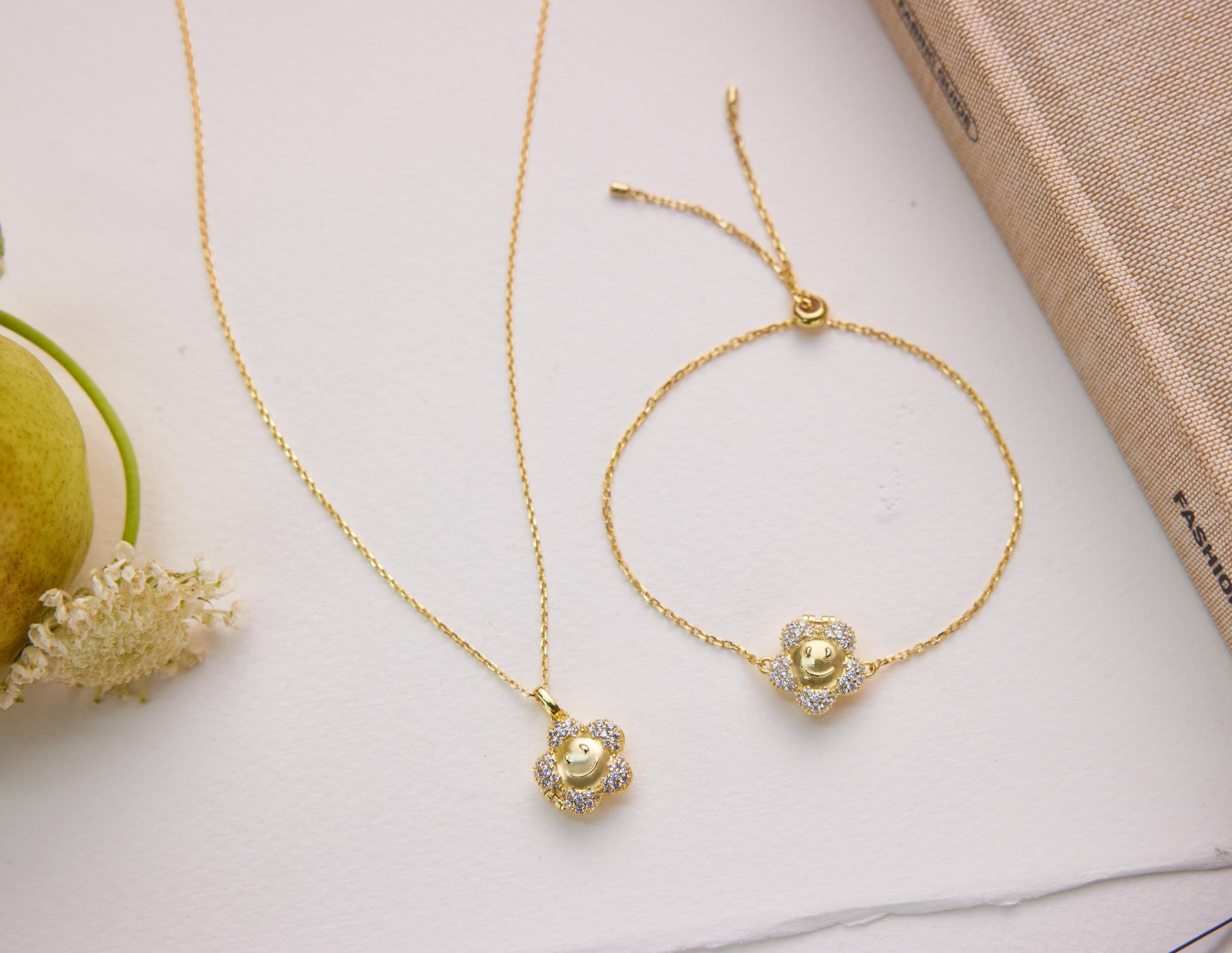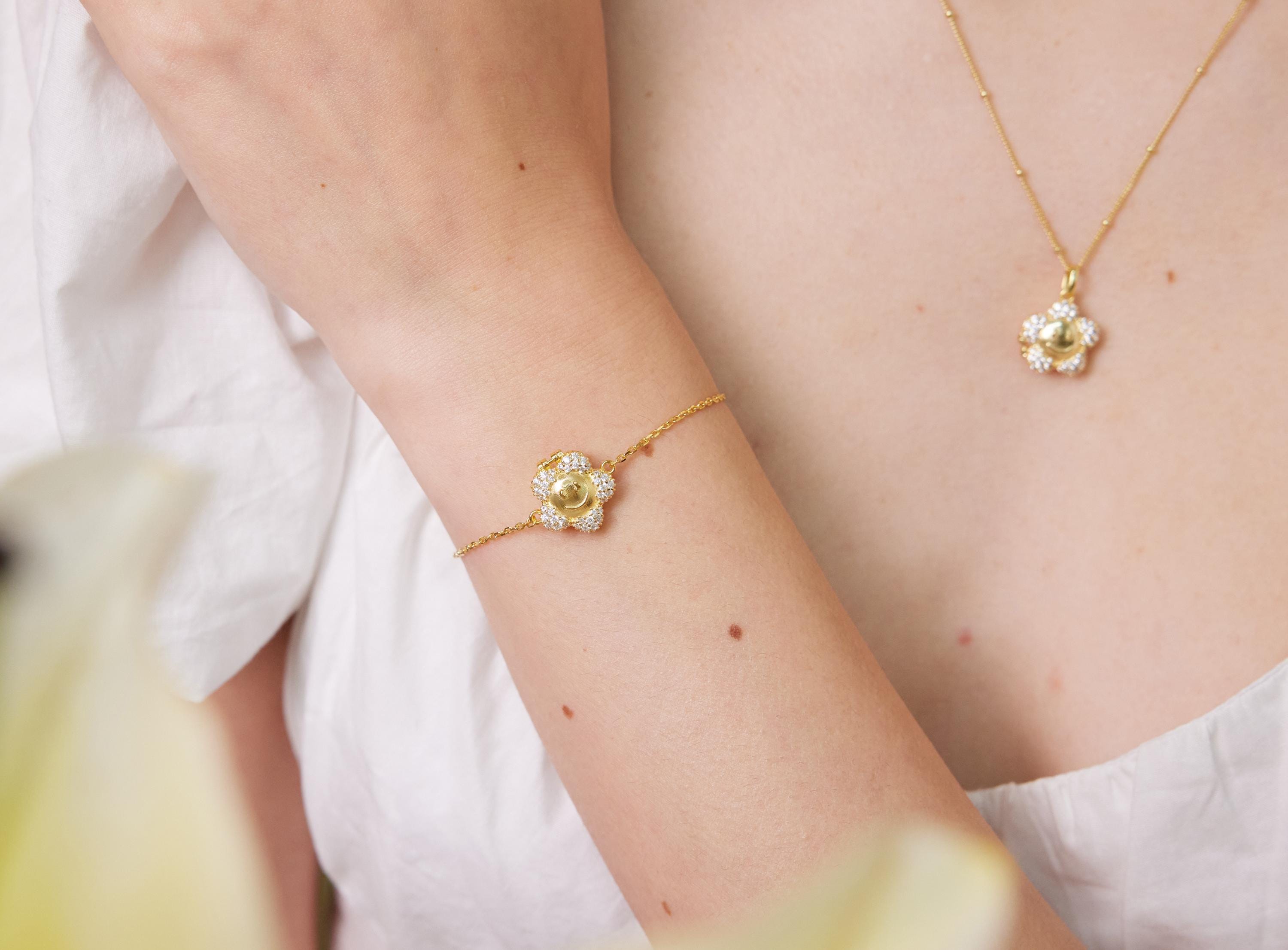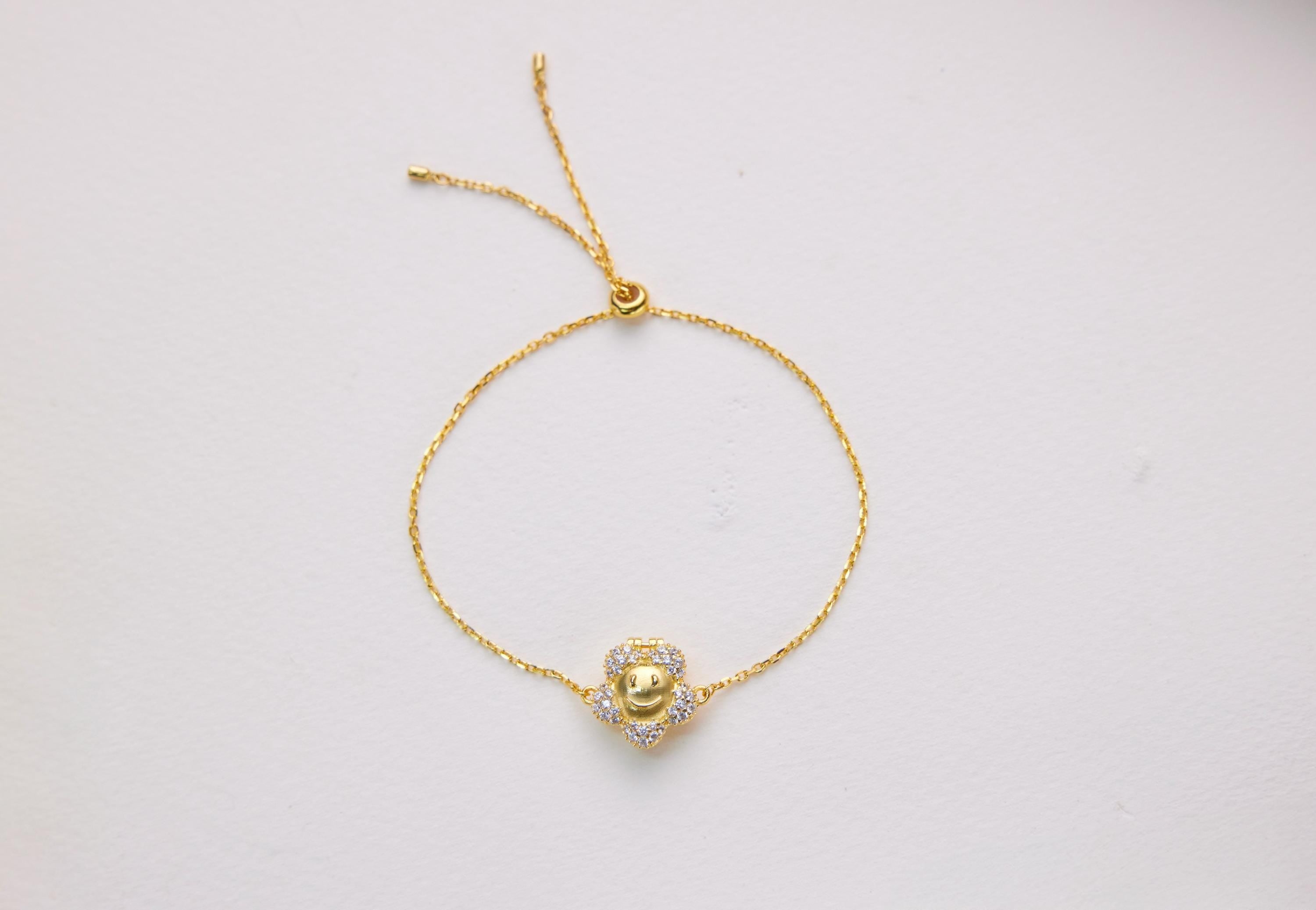Brighten every day with the cheerful charm of this Flower Smile Photo Bracelet. Featuring a 14mm flower locket, this bracelet holds two precious photos, keeping your loved ones close at all times. The delicate smiley flower design, accented with pavé diamonds, symbolizes joy and warmth, making it a perfect sentimental piece to carry with you wherever you go.