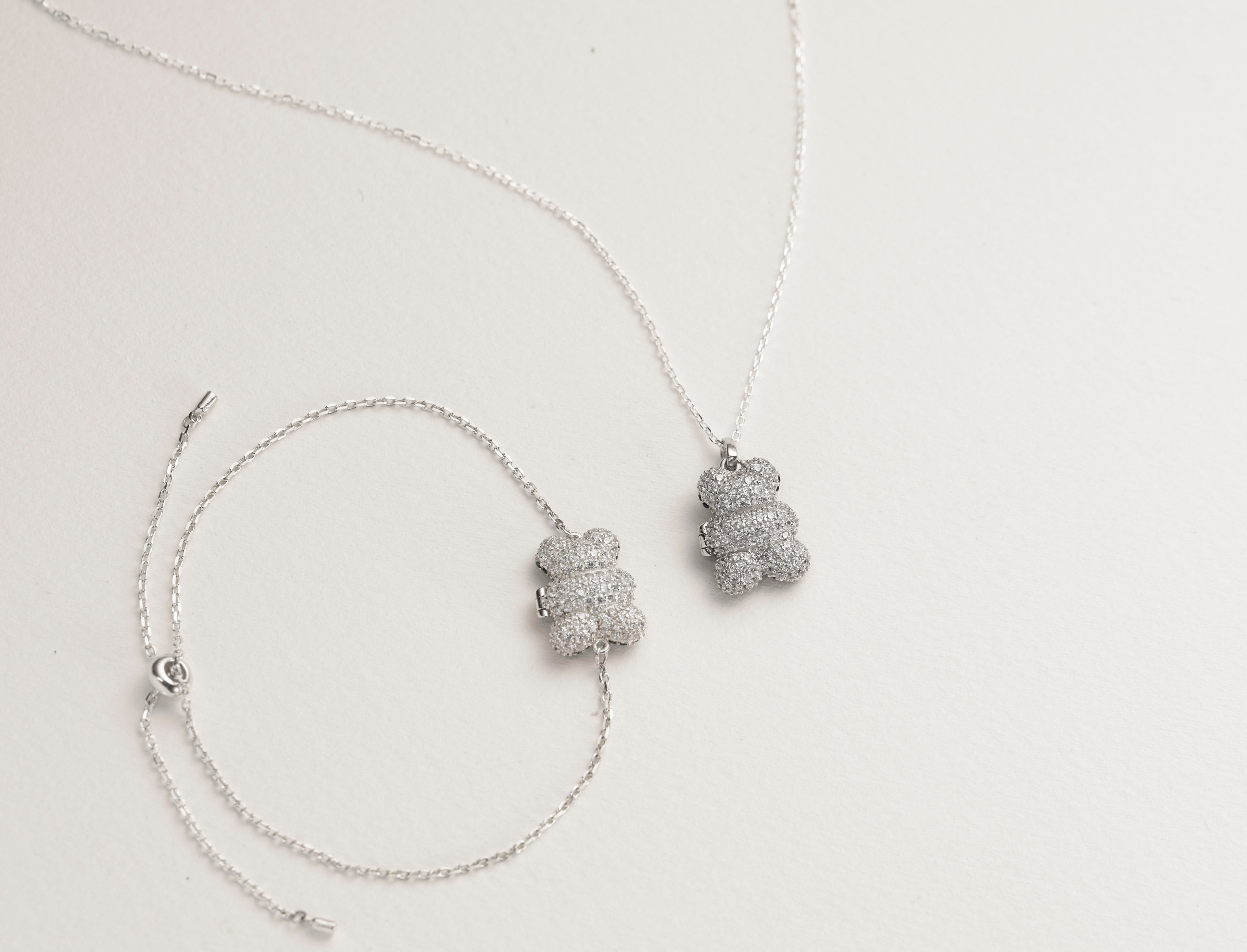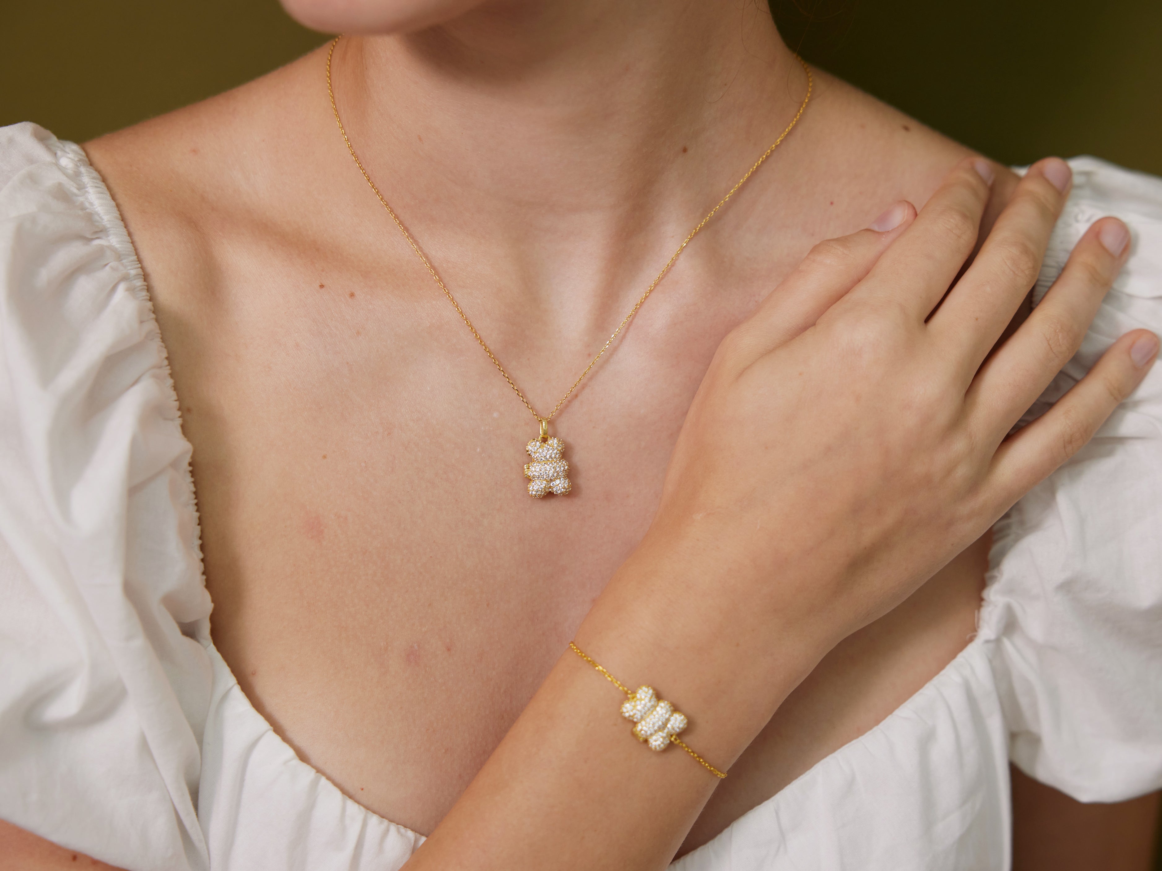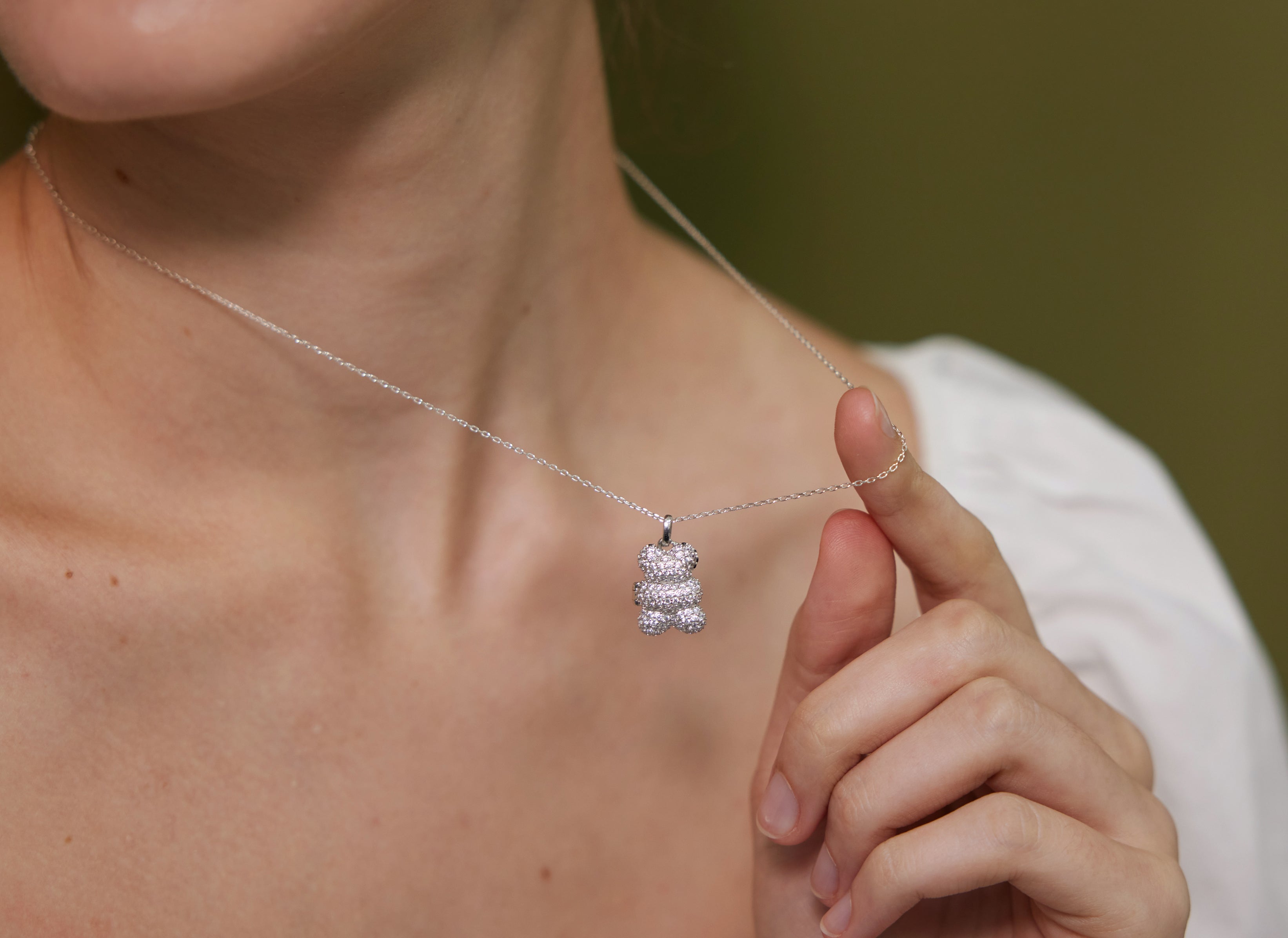 Each bear is hand-set with brilliant cubic zirconia crystals, catching the light like sugar crystals on candy. Its playful silhouette contrasts with the luxury of fine materials — a delicate reminder that sophistication and whimsy can live beautifully together.