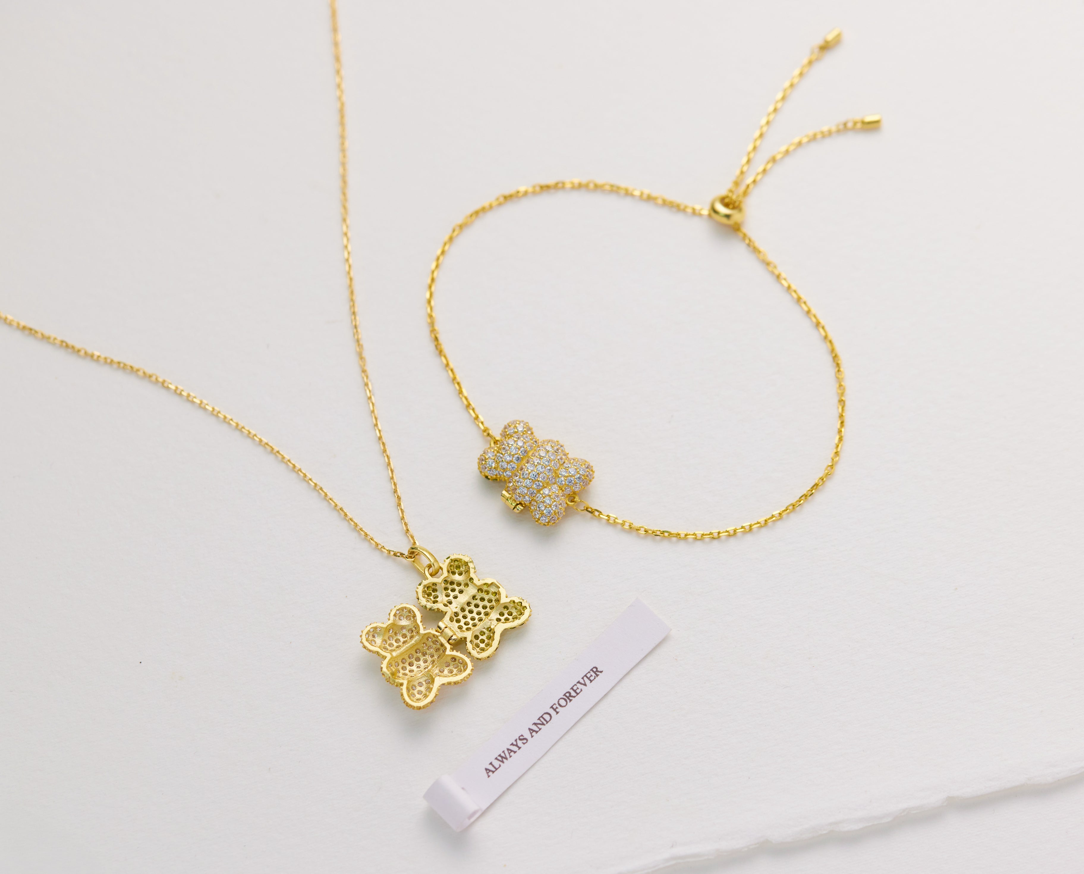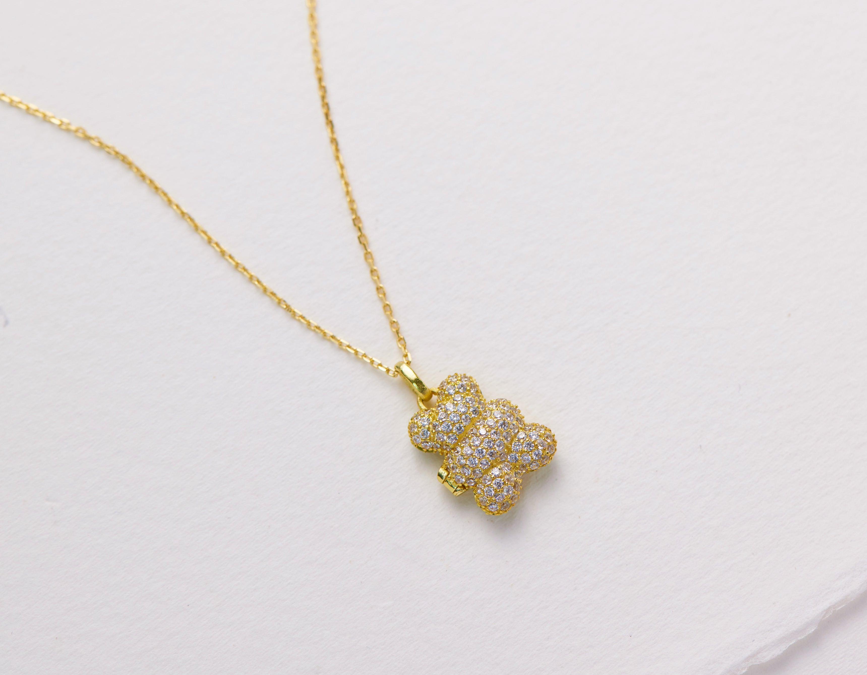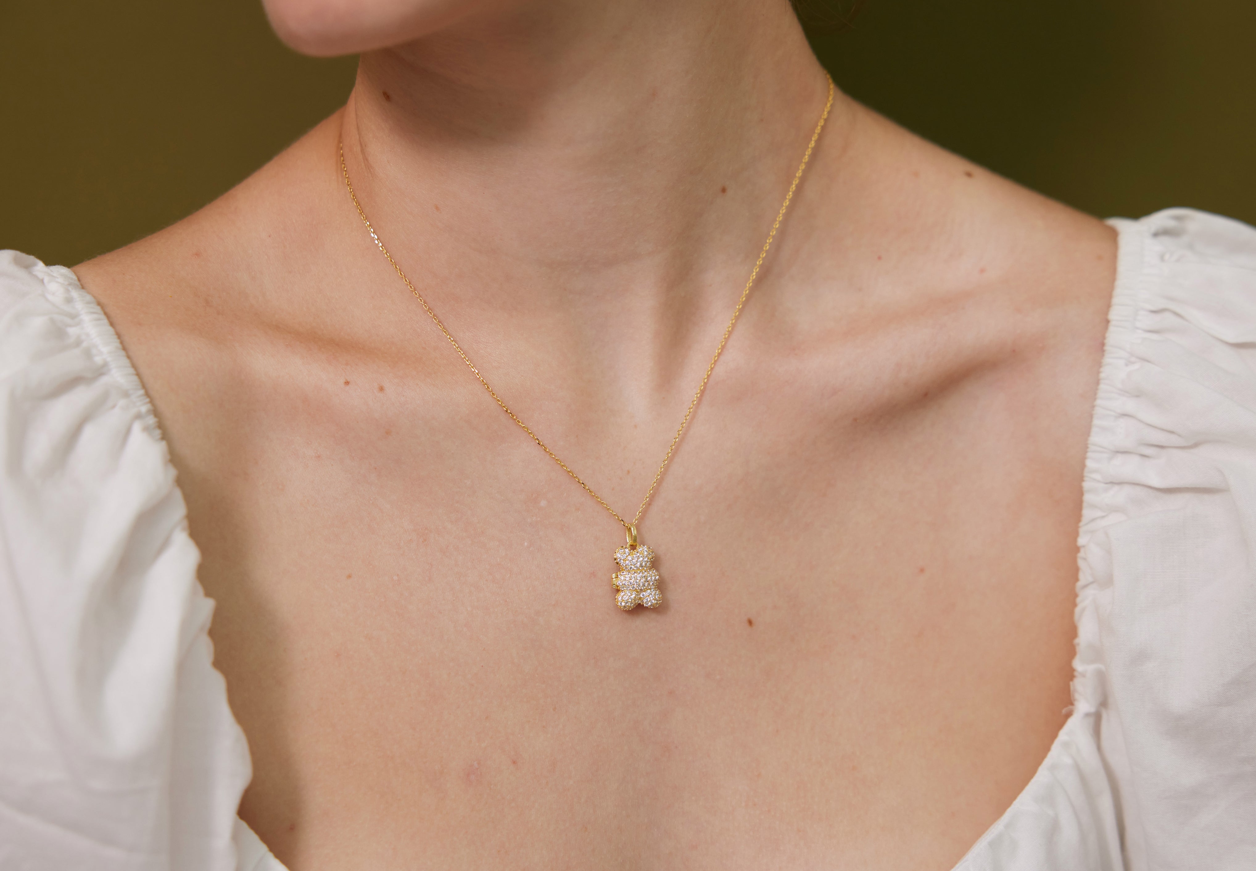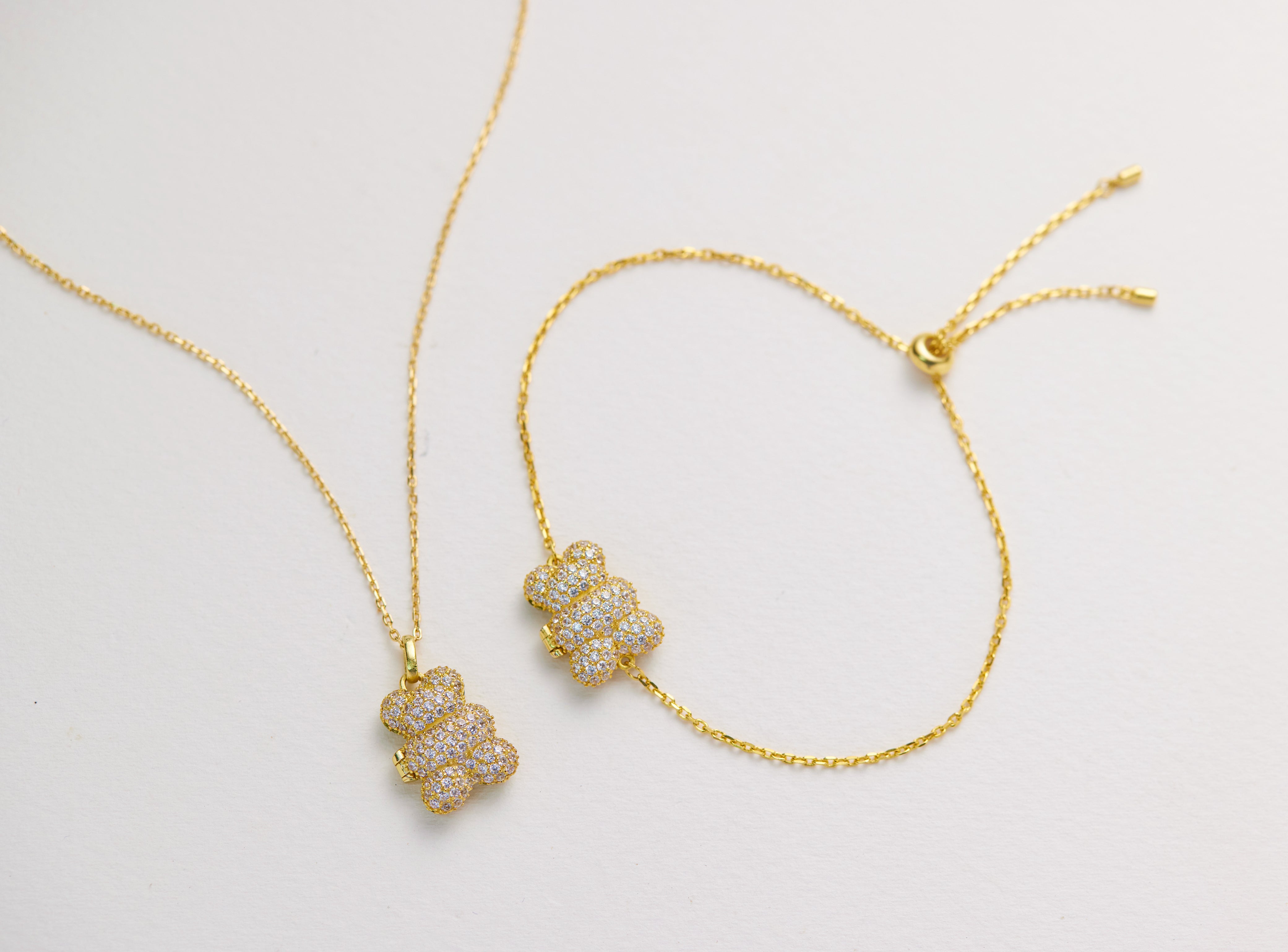 Each bear is hand-set with brilliant cubic zirconia crystals, catching the light like sugar crystals on candy. Its playful silhouette contrasts with the luxury of fine materials — a delicate reminder that sophistication and whimsy can live beautifully together.