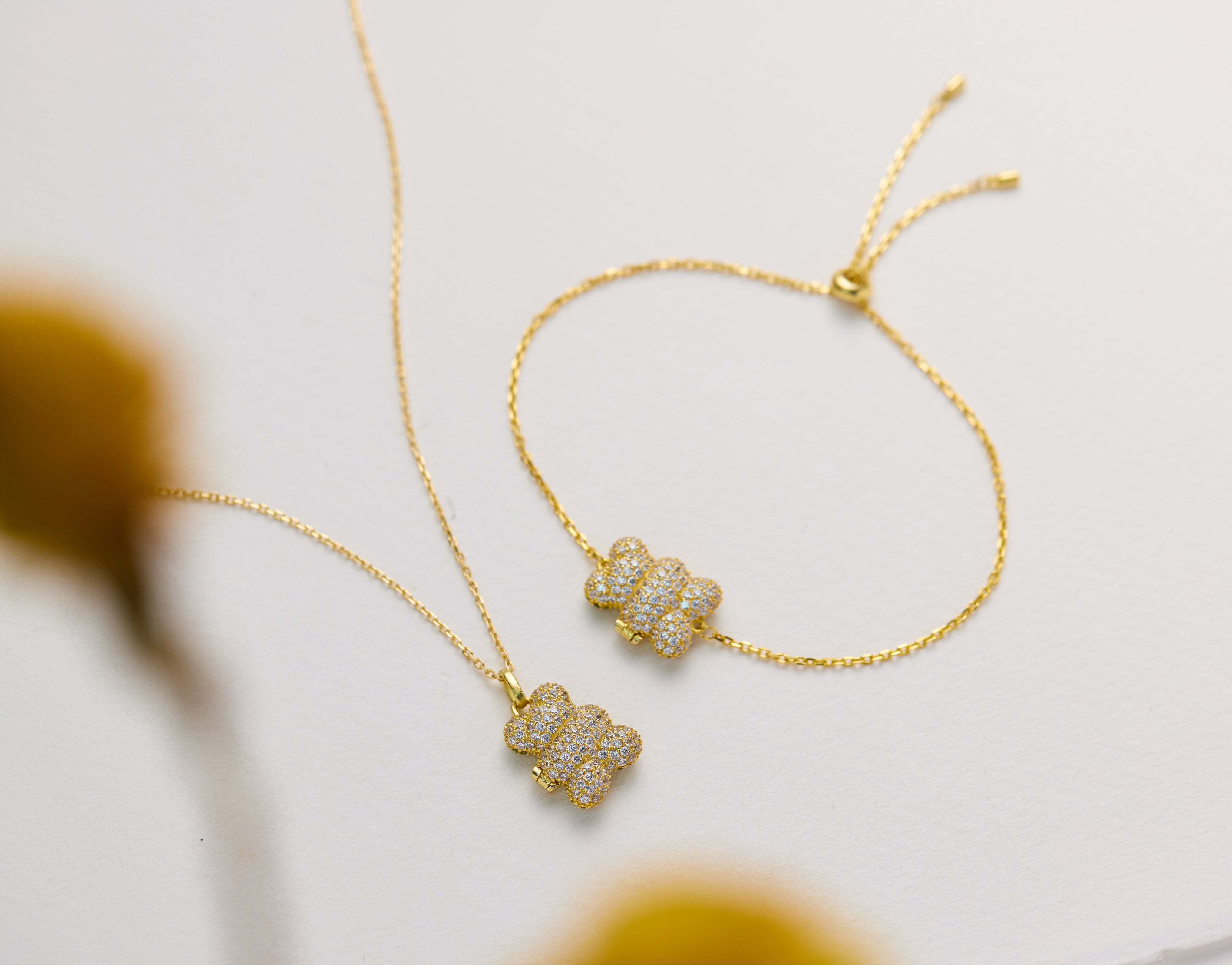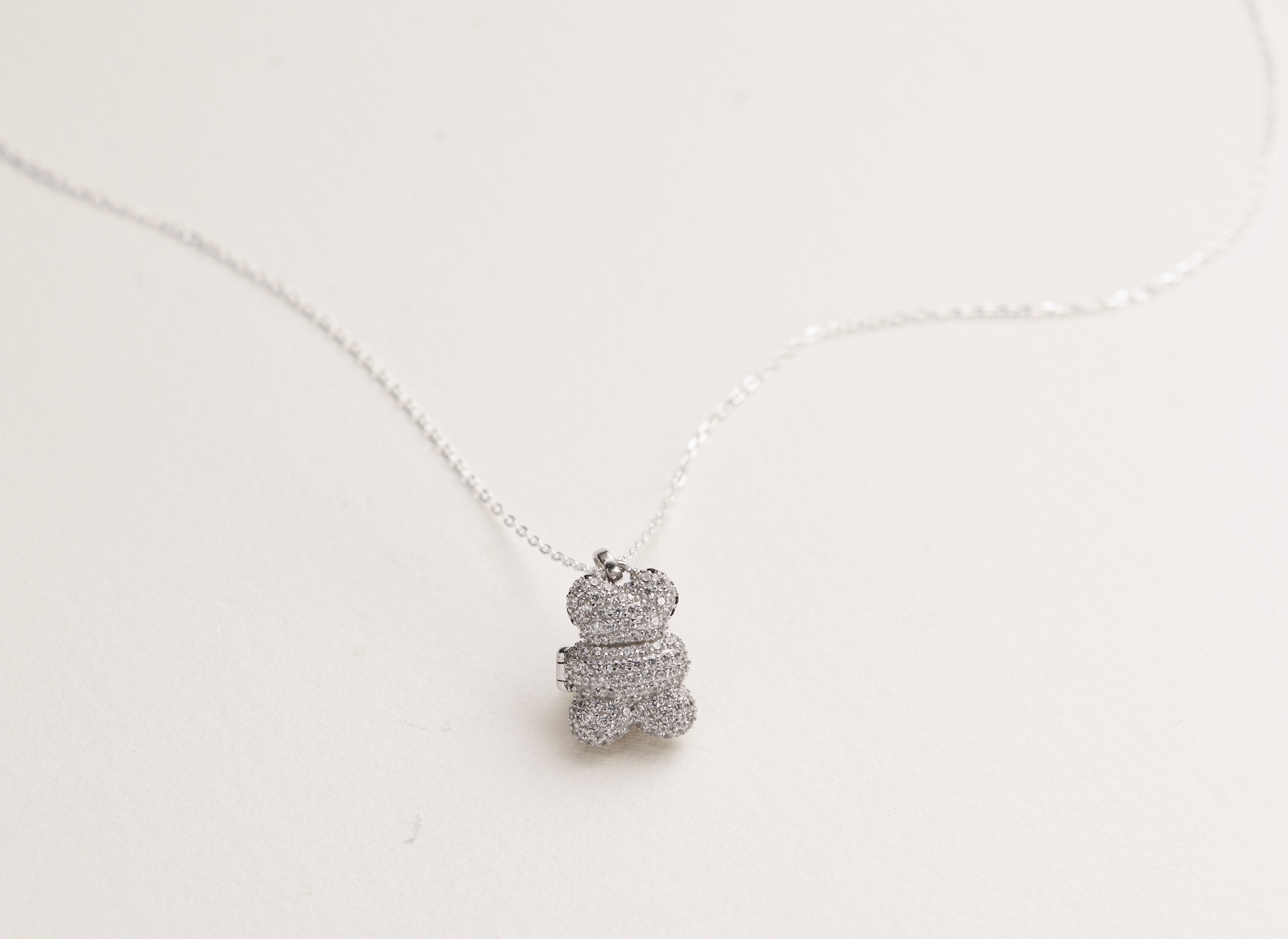 The Gummy Bear Locket Necklace captures the sweetness of nostalgia and the shimmer of modern elegance. Inspired by the carefree joy of childhood and the tender art of keeping memories close, this sparkling bear-shaped pendant opens to reveal a hidden compartment — perfect for a tiny note, secret wish, or word of love.