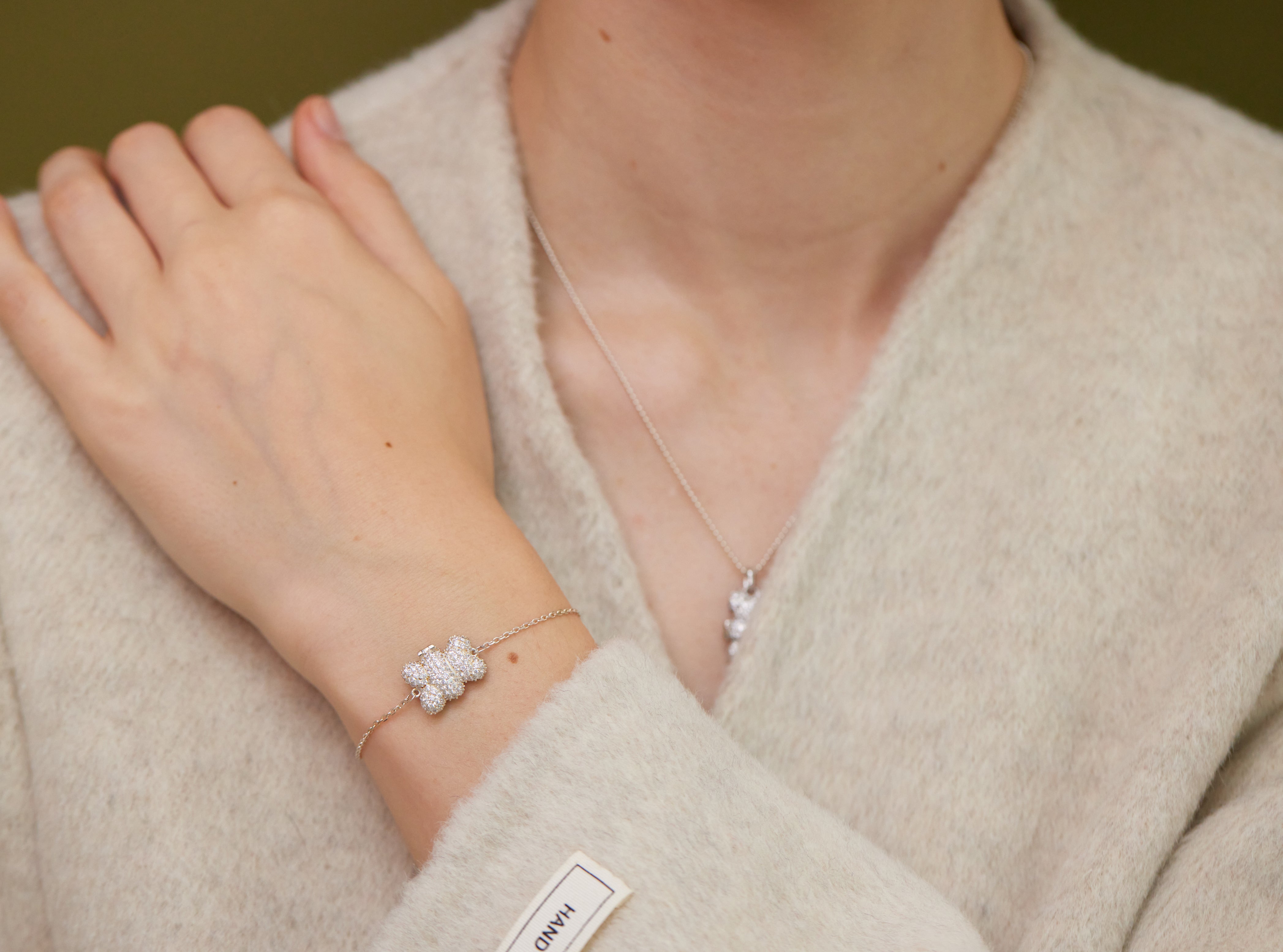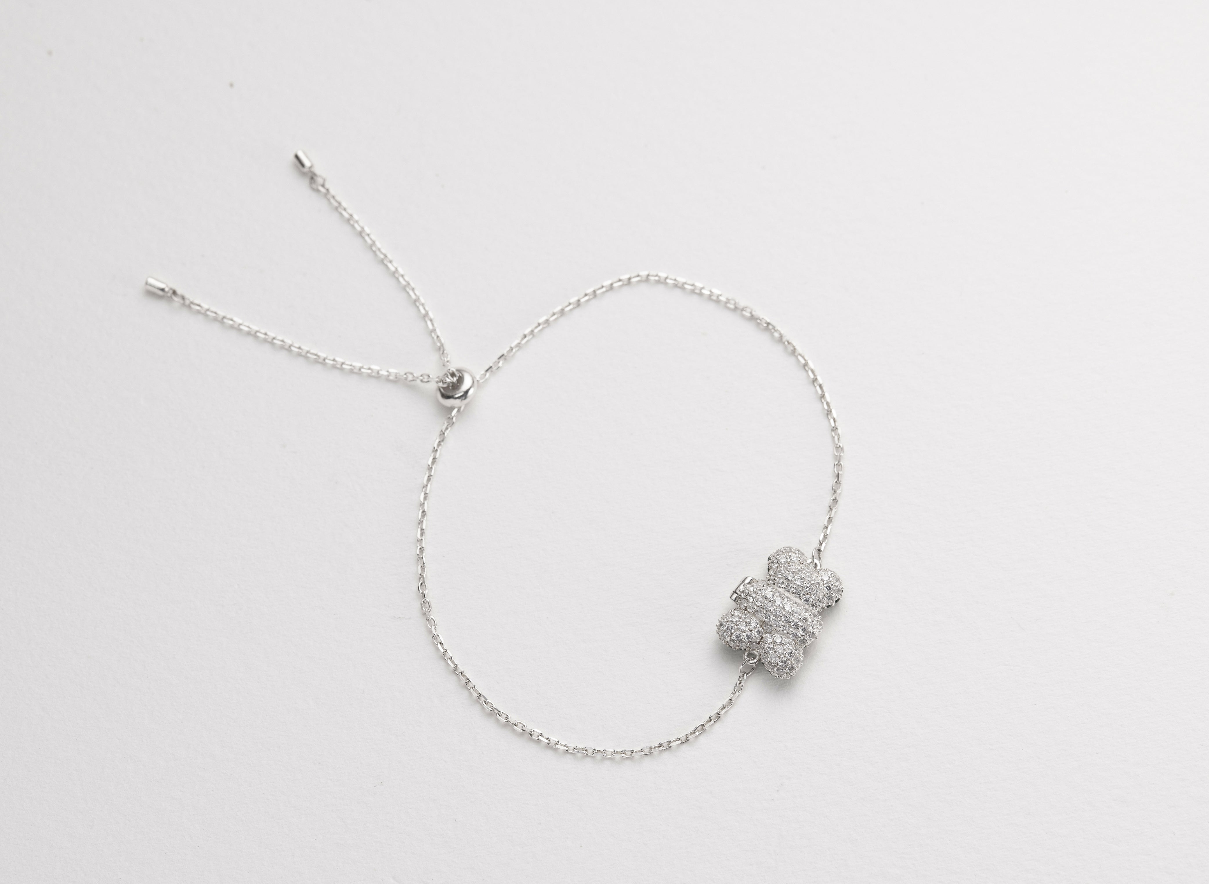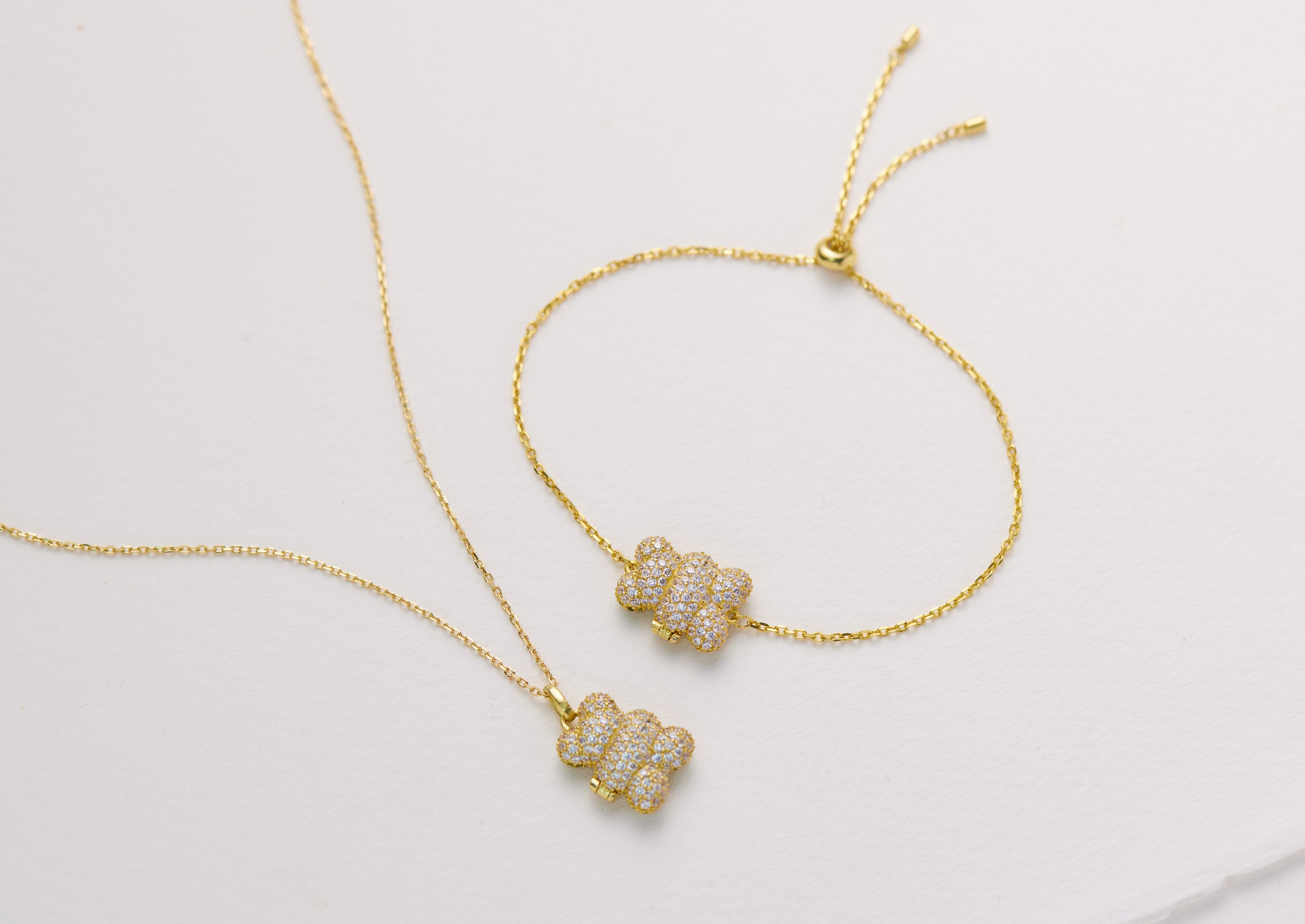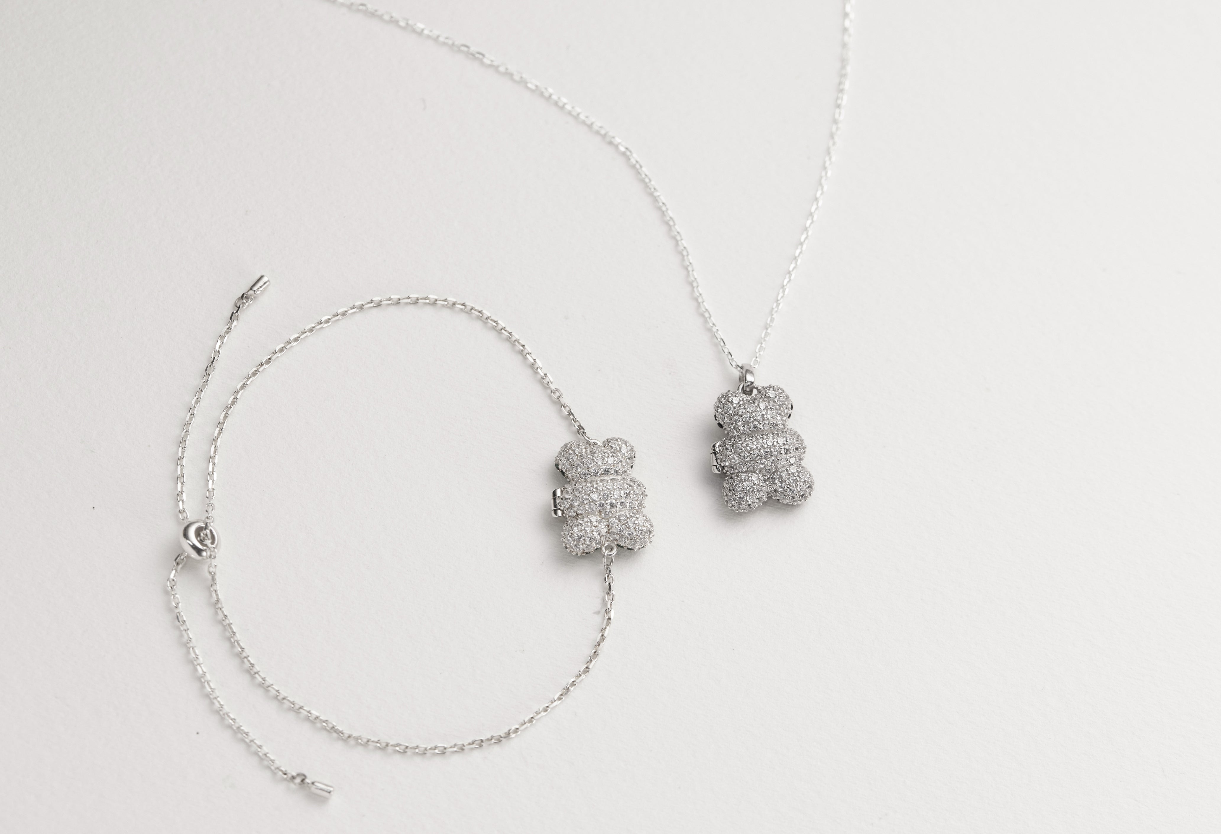 Each bear is hand-set with brilliant cubic zirconia crystals, catching the light like sugar crystals on candy. Its playful silhouette contrasts beautifully with the refinement of fine materials — a delicate reminder that sophistication and whimsy can live side by side.