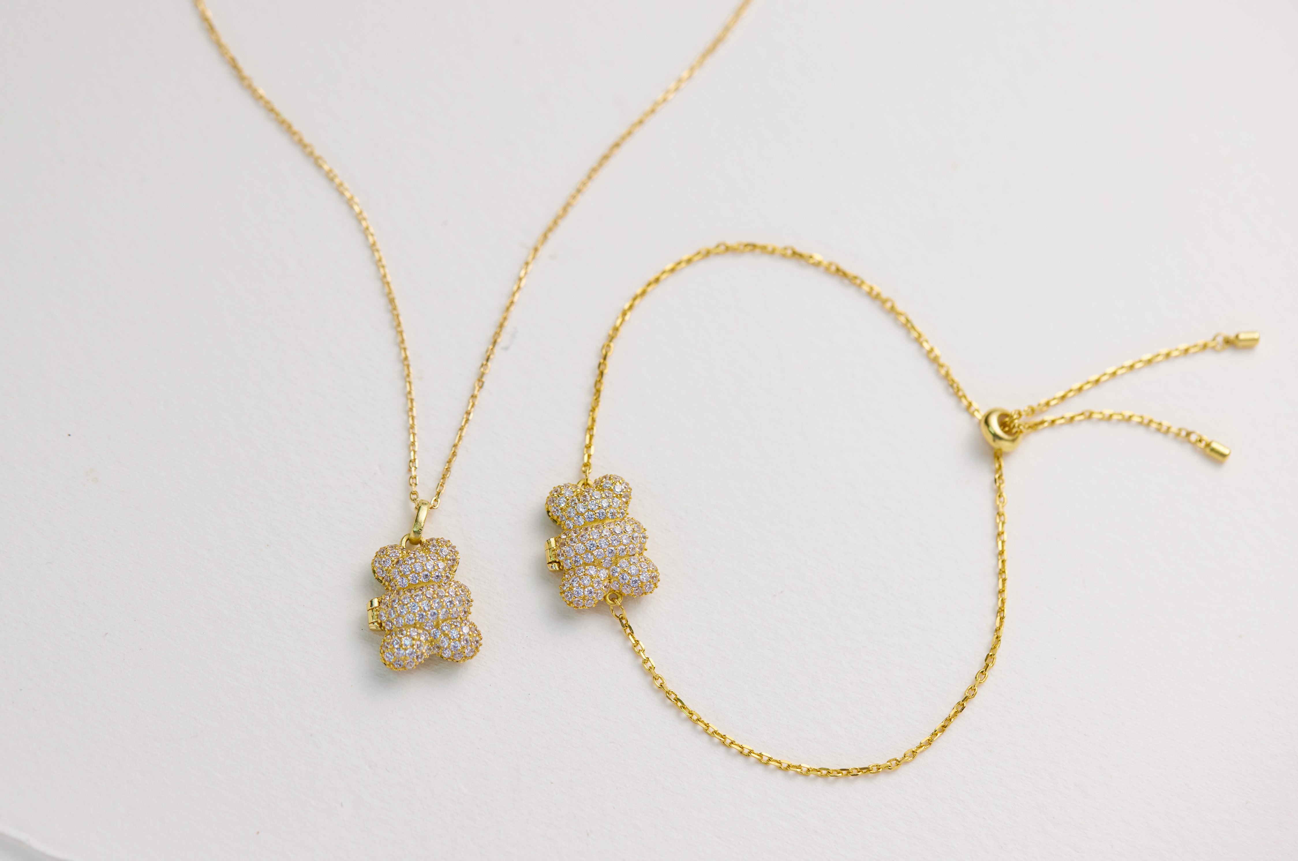 The Gummy Bear Locket Bracelet captures the sweetness of nostalgia and the shimmer of modern elegance. Inspired by the carefree joy of childhood and the tender art of keeping memories close, this sparkling bear-shaped charm opens to reveal a hidden compartment — perfect for a tiny note, secret wish, or word of love.