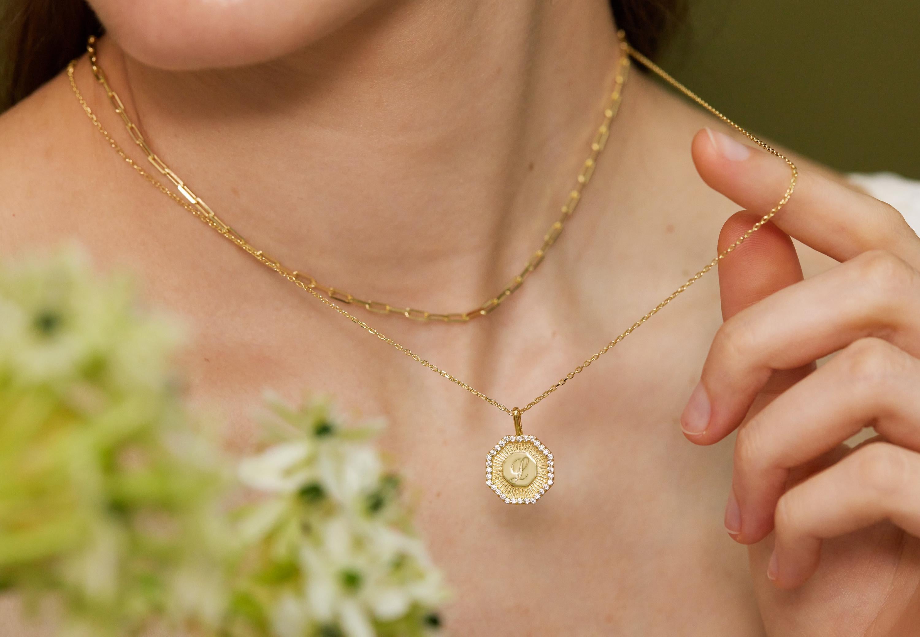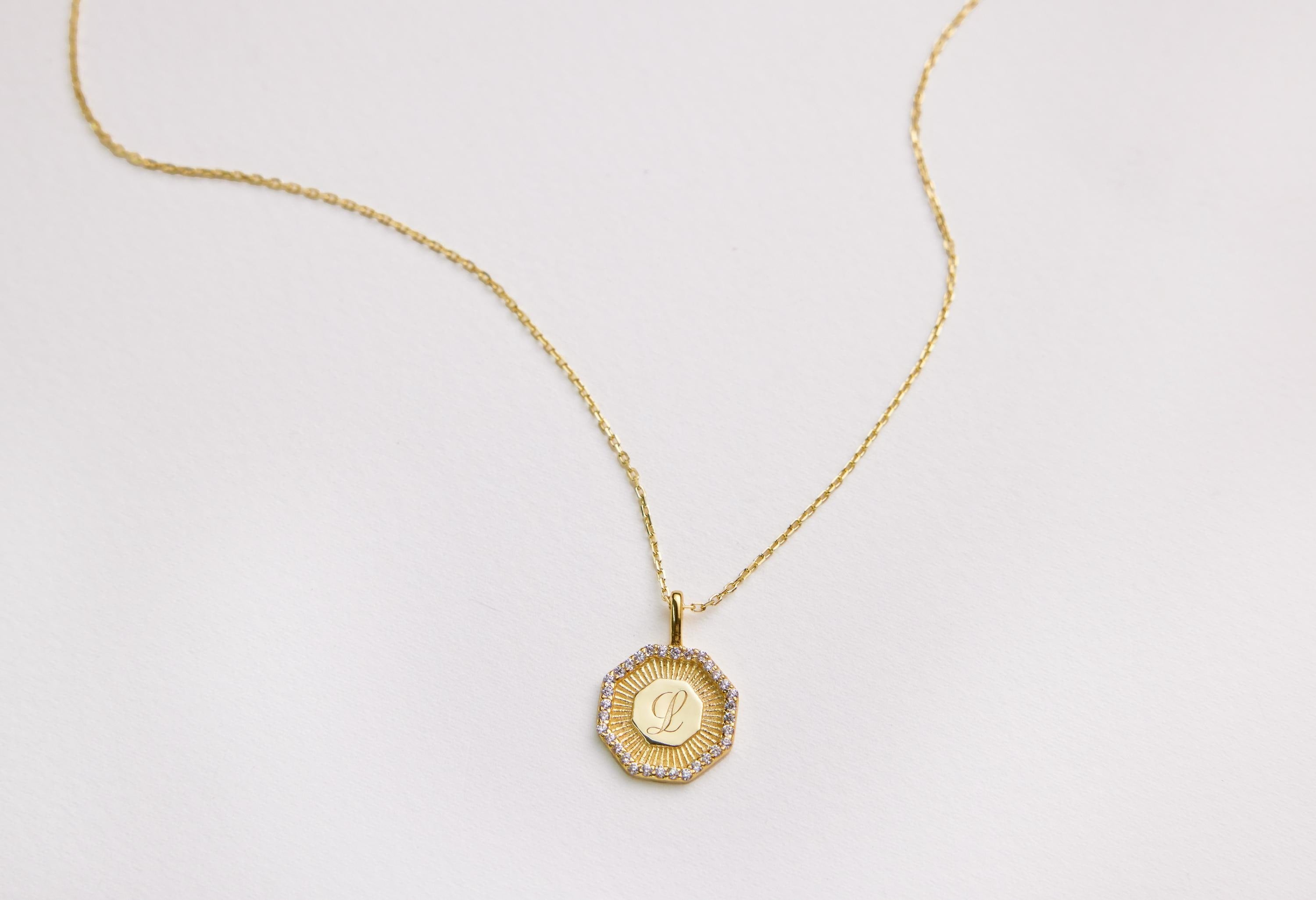 Create a meaningful, personalized piece with this stunning Hexagon Letter Pendant Necklace. This unique design features your chosen initial engraved on the front, with the option to add custom text or a symbol on the back, making it a truly one-of-a-kind keepsake. The hexagonal pendant is elegantly finished with a pavé diamond edge that sparkles with every movement, adding a luxurious touch to the personalized design.