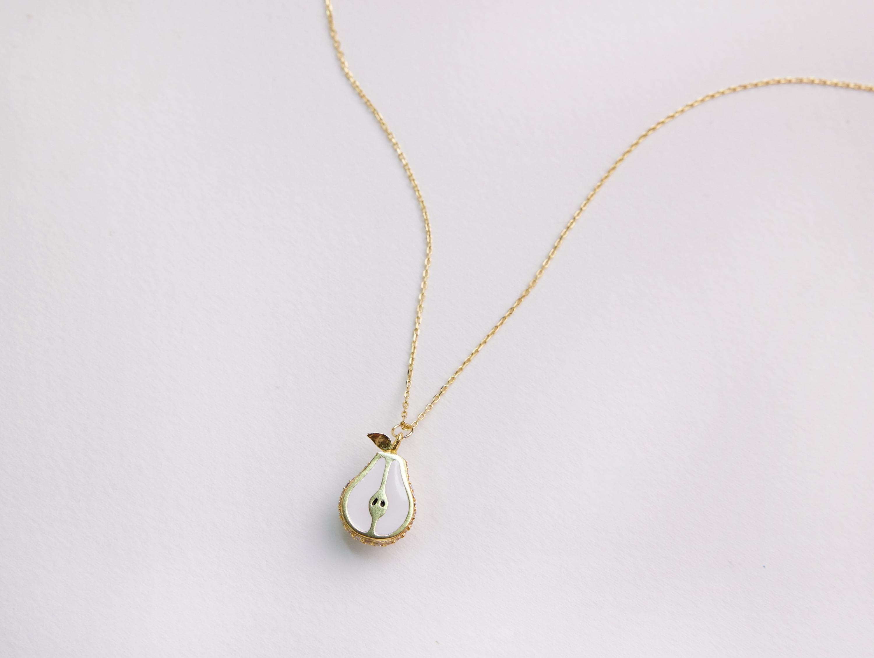 Inspired by the delicate beauty of nature, this Diamond Pear Pendant Necklace captures the essence of elegance, grace, and luxury. The pear-shaped design symbolizes both strength and femininity, with its elegant curves and sparkling diamond pavé accents. A timeless piece that reflects the light and beauty of life's most precious moments, this necklace is perfect for any occasion—whether it’s a special celebration or simply a luxurious addition to your everyday style. Wear it as a reminder of the elegance that surrounds us and carry that beauty wherever you go.